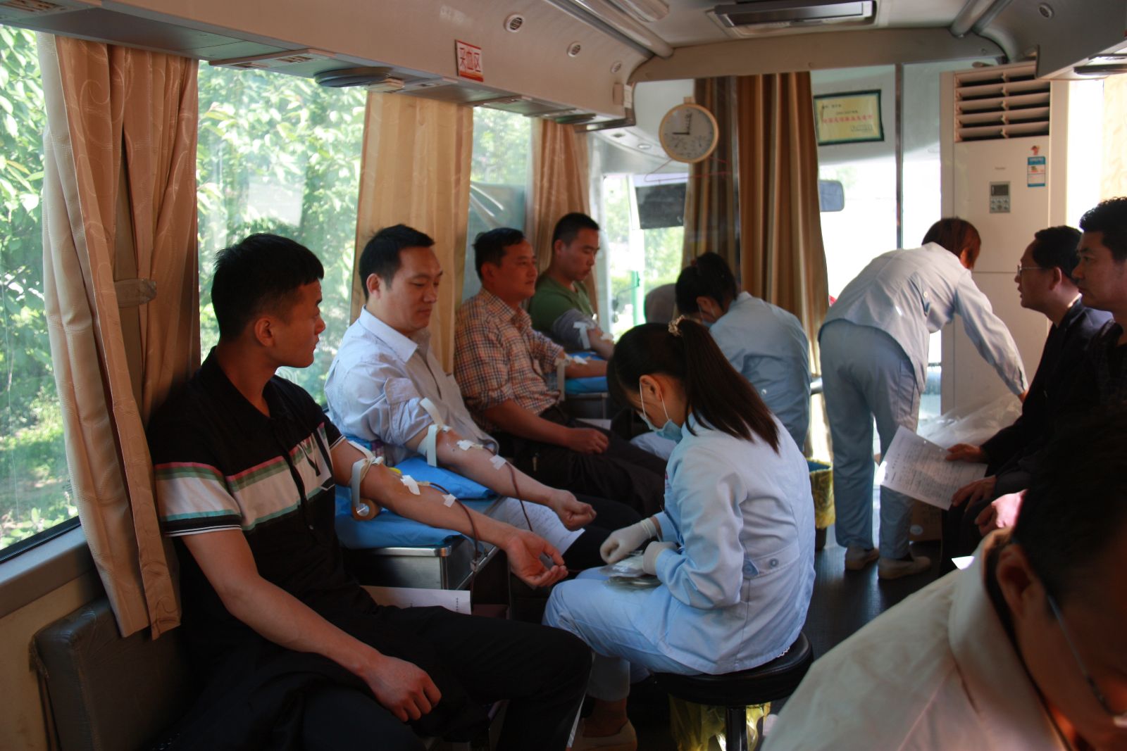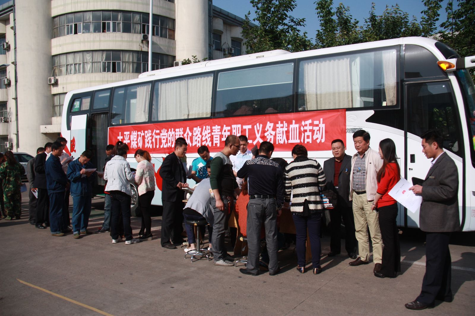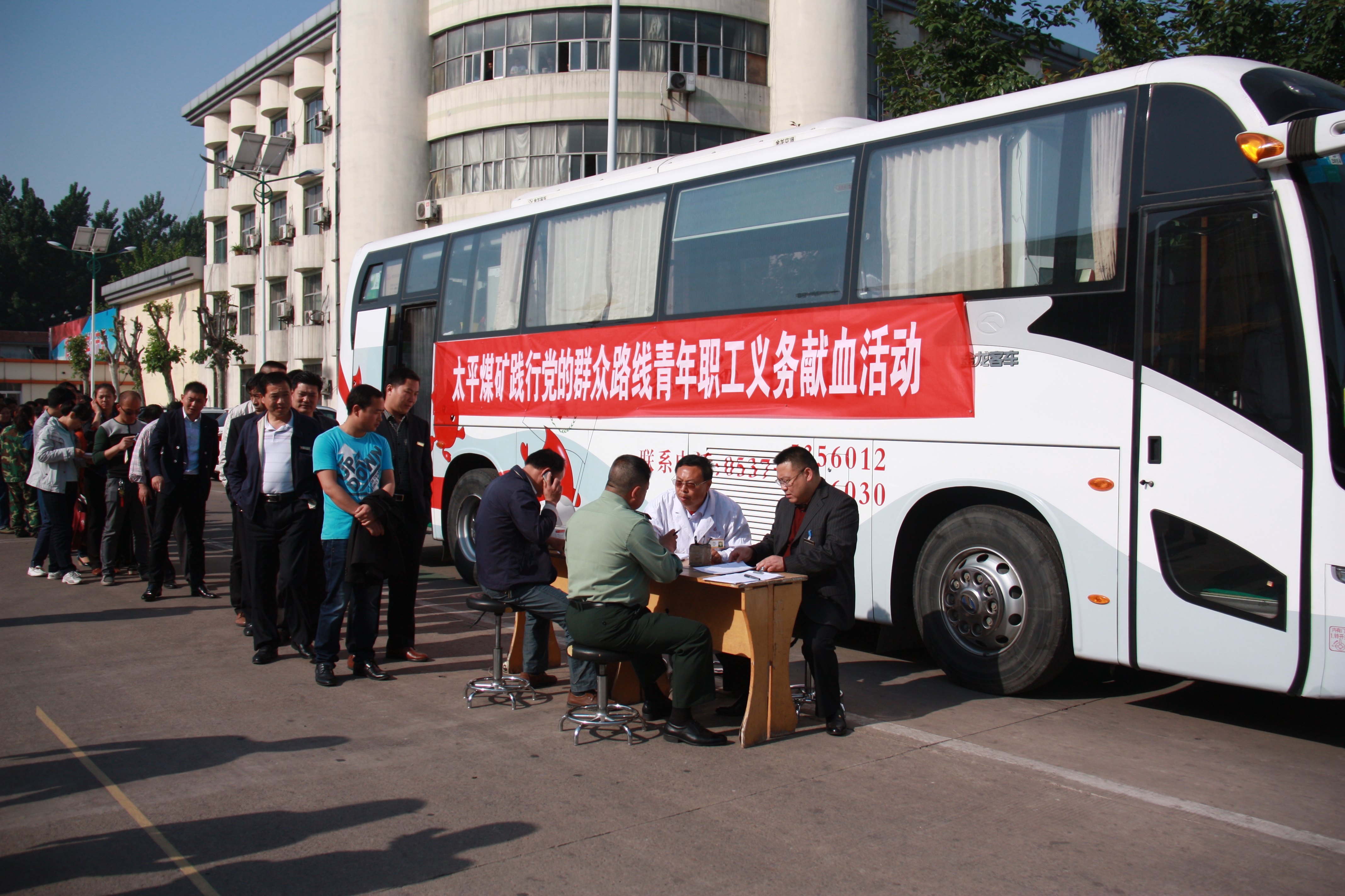 为更好的推动党的群众路线教育实践活动深入开展,促进矿精神文明建设系统工程提质升级,5月6日,太平煤矿团委、工会、卫生所联合组织开展全矿青年职工义务献血活动。来自济宁市中心血站的工作人员为该矿义务献血的青年职工提供了现场指导和服务工作。大家积极填表、化验、采血、信息录入、领取纪念品,秩序井然。